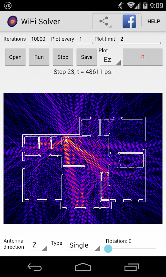 WiFi Solver FDTD. Pak jsem asi hodinu připravoval plánek bytu podle požadavků aplikace v png s barevným rozlišením stěn, oken a dveří. Sice v návodu píší, pokud jsem to správně pochopil, že 1 cm má odpovídat 1 pixelu, ale spíš je lepší se držet dalšího doporučení o velikosti obrázku 500 x 500 px. Iterace se mi osvědčilo nastavit na 1000. Výsledek víceméně splnil očekávání a ujasnil i potvrdil mou představu o šíření signálu. Zatím pokračuji ve výpočtech různých variant možného umístění routeru.